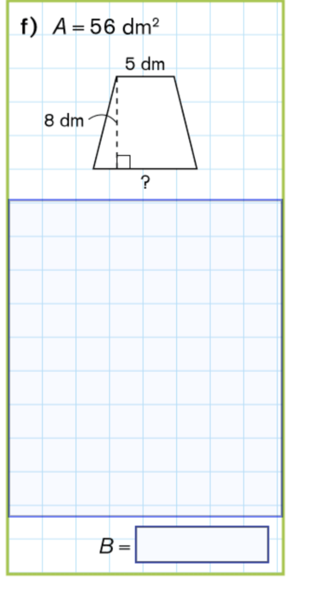On sait que A=56 dm², h=8 dm et b=5 dm. En insérant ces données dans notre formule, on a :