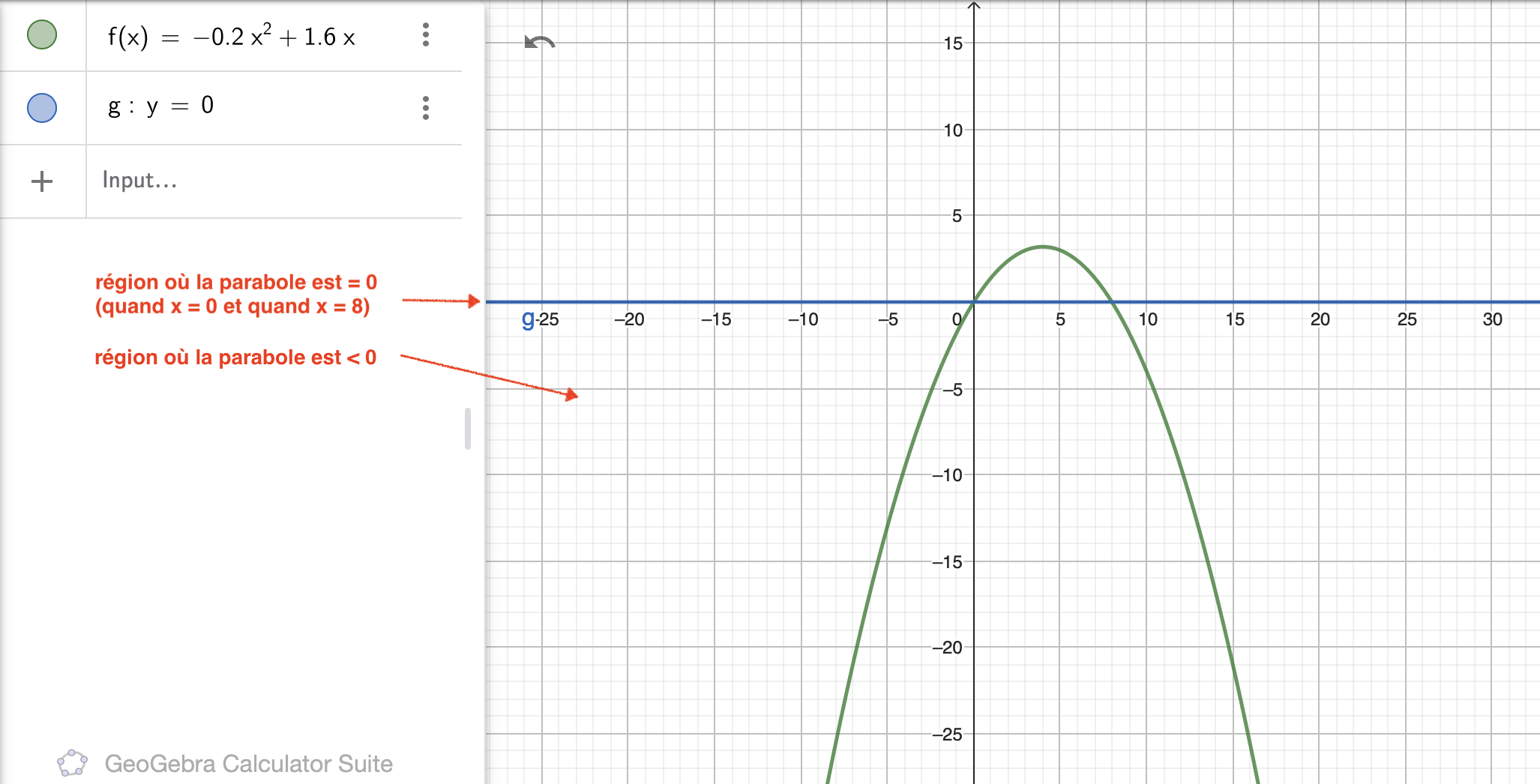 "J'ai determiné l'ensemble-solution de l'inéquation: - 0,2x^2 + 1.6x +40 <= 40. La réponse est ]- infini, 0] U [8, +infini]. J'aimerais savoir pourquoi le 0 et le 8 sont inclus svp. Merci"