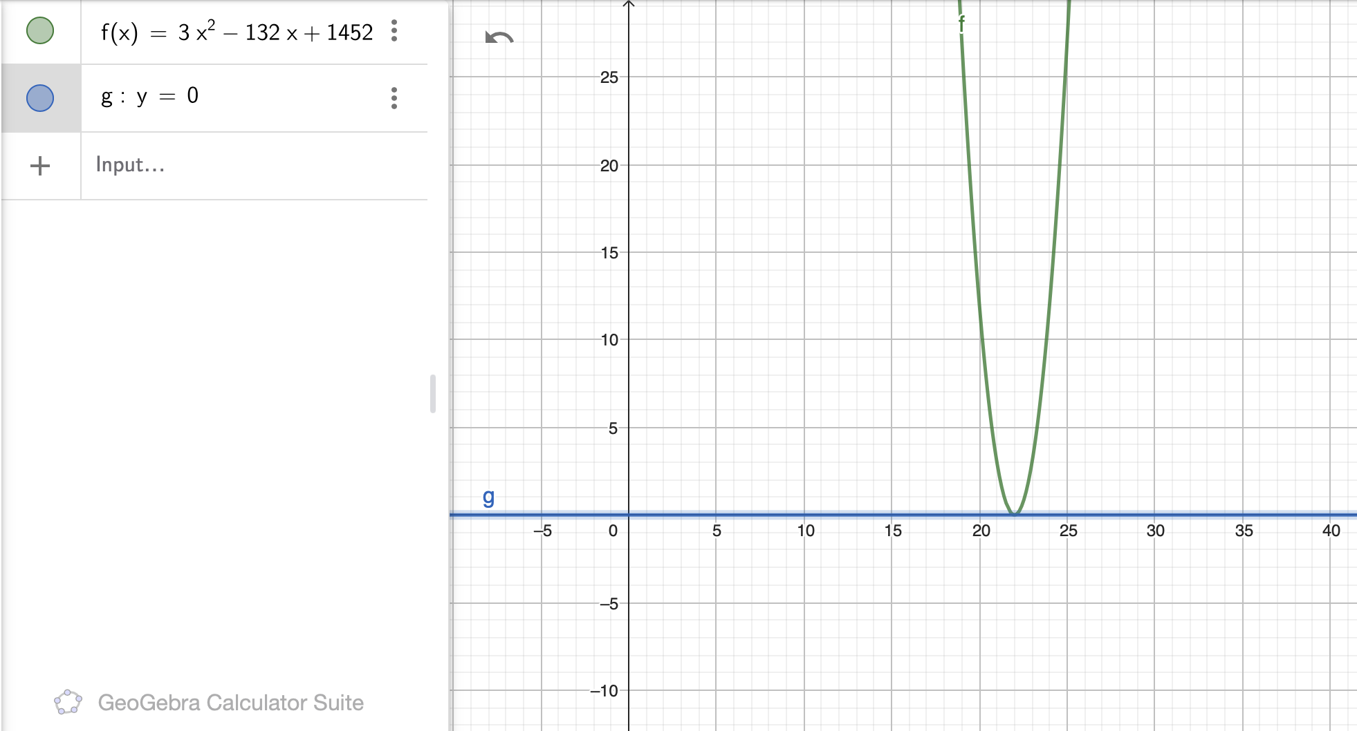 "Je dois représenter graphiquement les solutions des inéquations. J'ai fait le numéro étant: -1000 ­­<= 3x^2 -132x + 452. Ma réponse fut x = 22."
