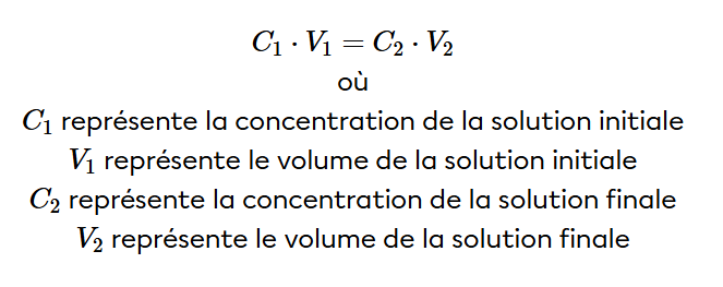 Une chose qui est importante à noter est que les unités sont constantes dans la formule pour la concentration ainsi que pour le volume. Ça signifie que tes deux variables de volume V1 et V2 doivent être dans les mêmes unités (donc toutes les deux en mL ou en L par exemple) et que tes variables de concentration sont aussi dans la même unité (donc si tu fais un calcul avec une concentration en %, l'autre concentration dans ta formule devra aussi être en pourcentage).