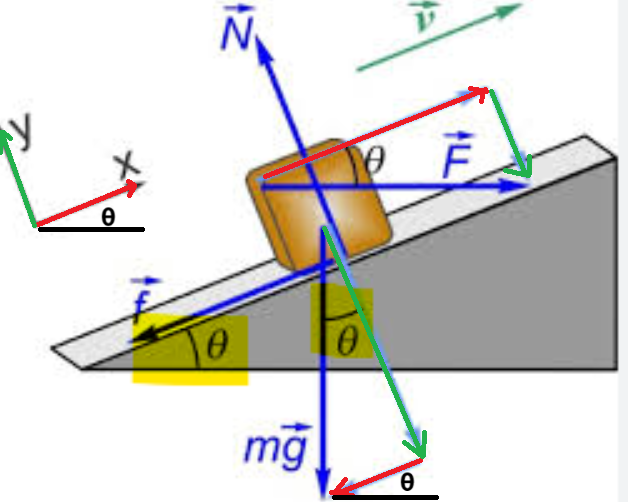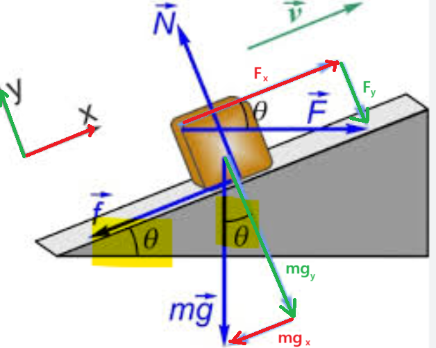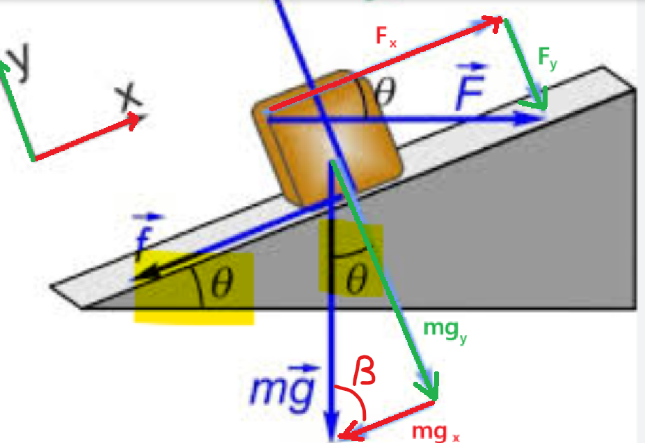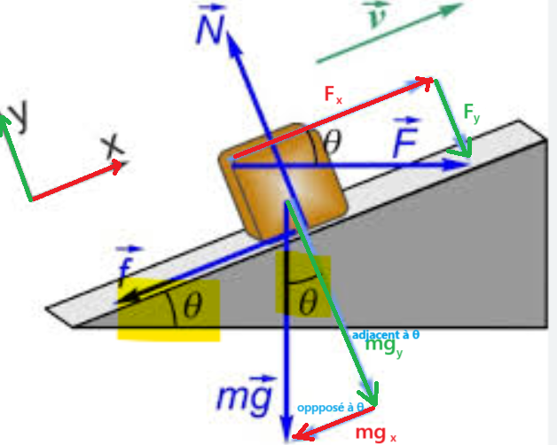 Pour les autres forces qui ne sont pas déjà parallèles à l'un des axes du référentiel que l'on a, donc ici \(\overrightarrow{F}\) et \(m\overrightarrow{g}\), il faut les décomposer de façon à former un triangle rectangle dont les cathètes (les composantes) sont parallèles aux axes de notre référentiel! C'est pourquoi la force \(m\overrightarrow{g}\) est décomposé en \(mg_{x}\) (qui est parallèle à l'axe des x) et \(mg_{y}\) (qui est parallèle à l'axe des y)! Même chose pour \(\overrightarrow{F}\) , que l'on décompose en \(F_{x}\) et \(F_{y}\).