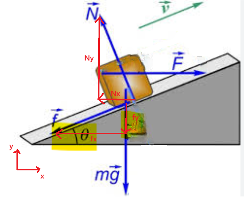 Cependant, il faudrait décomposer la force de frottement et la forme normale. Donc, on doit toujours décomposer une force selon les axes \(x\) et \(y\) de notre référentiel si elle n'est pas déjà parallèle à l'un des axes. Ainsi, c'est les composantes de ces forces qui seront parallèles aux axes. Par exemple, on voit dans le dessin ci-dessus que la composante en \(x\) de la force de frottement, soit \(f_{x}\), est parallèle à l'axe des \(x\), et la composante en \(y\), soit \(f_{y}\), est parallèle à l'axe des \(y\). Même chose pour la force normale, ses composantes \(N_{x}\) et \(N_{y}\) sont parallèles aux axes de notre référentiel.