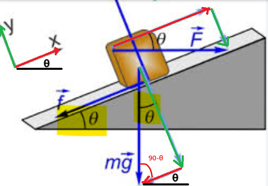 Ensuite, je n'arrive pas à démontrer et comprendre pourquoi, dans l'image ci-dessous, l'angle têta formé par le plan incliné et celui formé par les composantes de la force gravitationelle sont identiques?? Ça me confonds vraiment et je n'arrive juste pas à voir le pourquoi et le comment de ce fait.