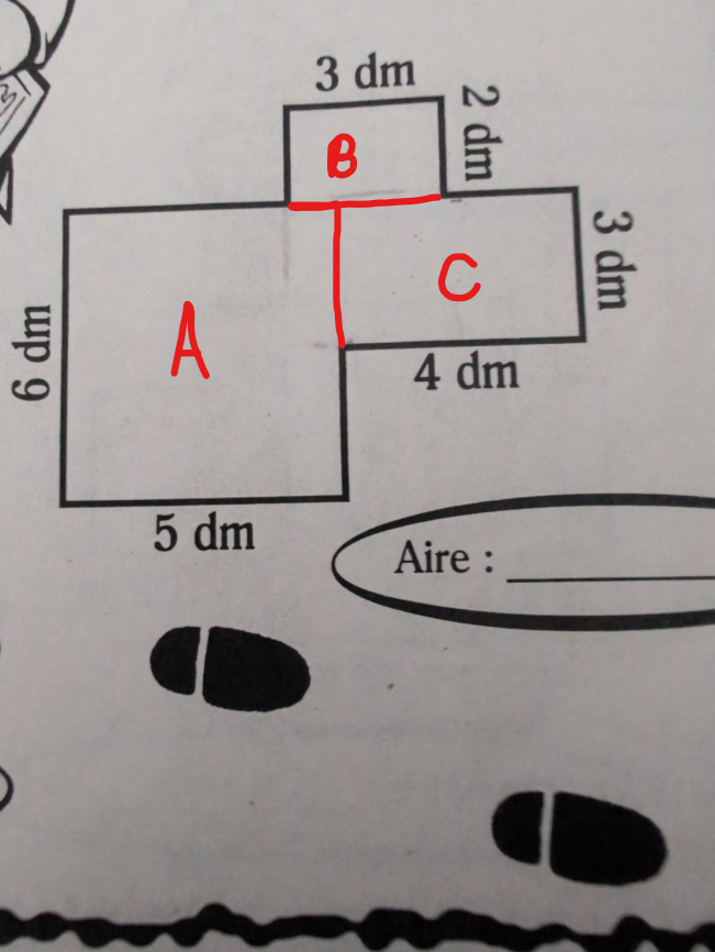 Donc ici c’est une figure géométrique qui peut se séparer en trois rectangles afin de trouver son aire.