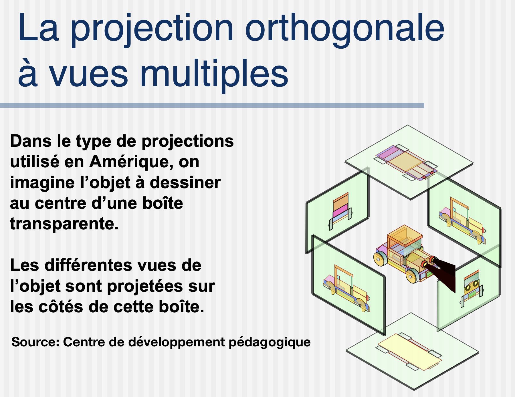 "Une projection orthogonale est une projection dans laquelle tous les rayons visuels partant des sommets de l’objet se dirigent perpendiculairement vers un observateur placé devant la feuille."