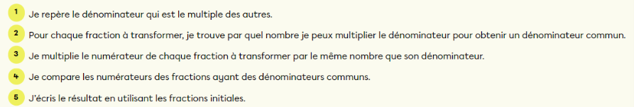 Puisque les dénominateurs ne sont pas pareils, alors tu dois transformer les fractions en des fractions équivalentes pour qu'elles aient toutes le même dénominateur. Tu pourras ensuite comparer les fractions en comparant les numérateurs. En résumé, pour ordonner des fractions ayant des dénominateurs différents, tu dois suivre ces étapes :