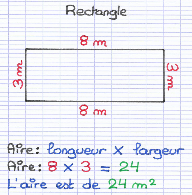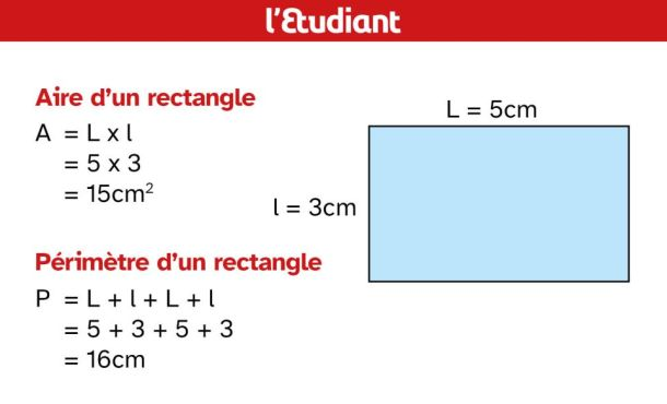 Pour l'aire, tu dois utiliser la formule l x L, ou longueur x Largeur. Dans le cas de notre rectangle, la formule se traduit par: