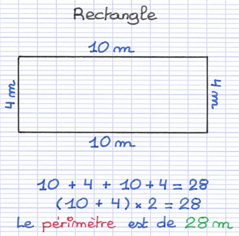 Le périmètre se calcule en additionnant tous les côtés ensembe. Dans le cas du rectangle, cela se traduit donc par: