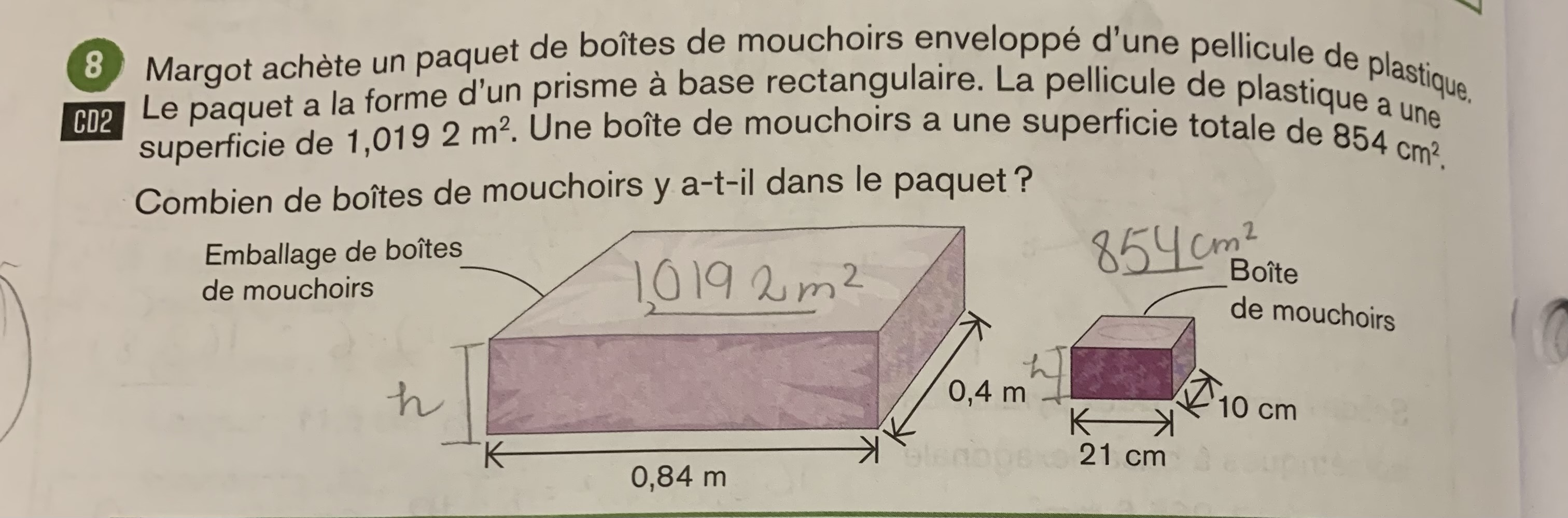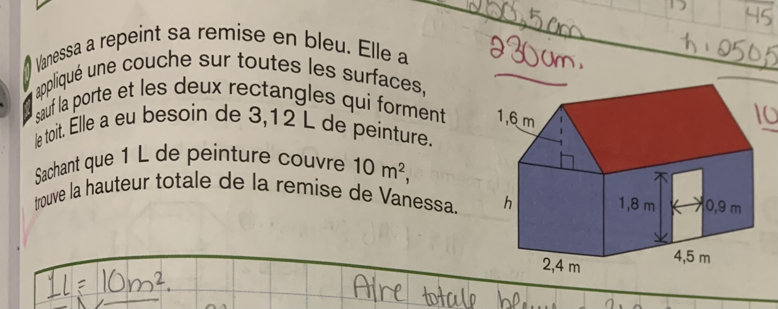 Pour le premier exercice, commence par trouver la formule de l'aire totale de la grange (laisse la lettre h pour la hauteur). Ensuite, soustrais l'aire des deux rectangles et de la porte blanche. Finalement, à l'aide des informations données (elle a eu besoin de 3,12L de peinture, qui équivaut à (3,12*10m2) 31,2 m au carré), tu peux mettre en égalité cette aire avec la formule algébrique trouvée pour calculer l'aire totale de la grange. Cela te permettra d'isoler le h.