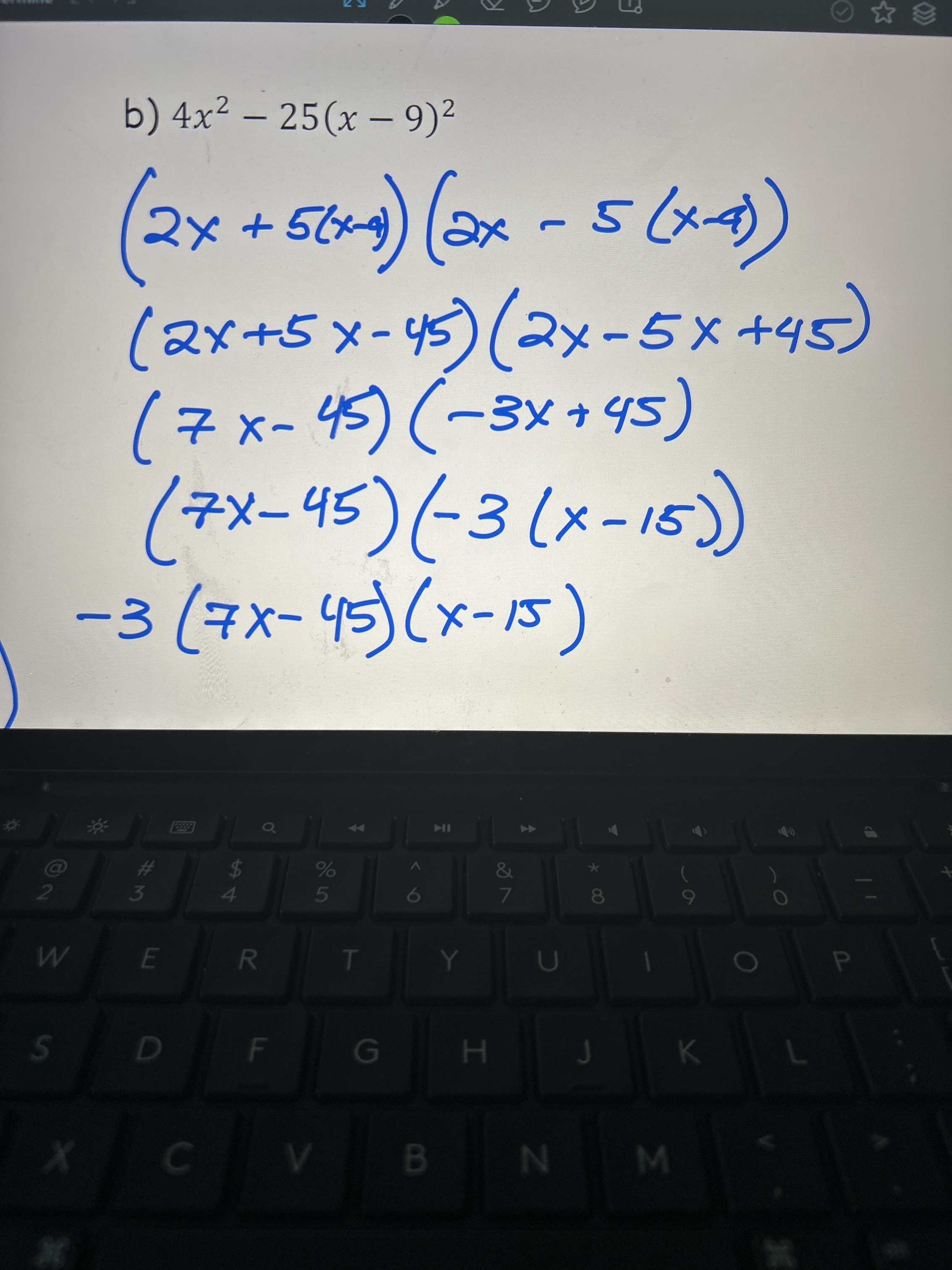 Secondary IV • 1mo.Bonsoir, je dois factorisée au maximum cette expression. Voici la réponse du prof (en blue). Pourquoi est ce qu’on applique la distributivitée au chiffre 5 dans ce cas, à la première ligne (2x +5 (x - 9))?