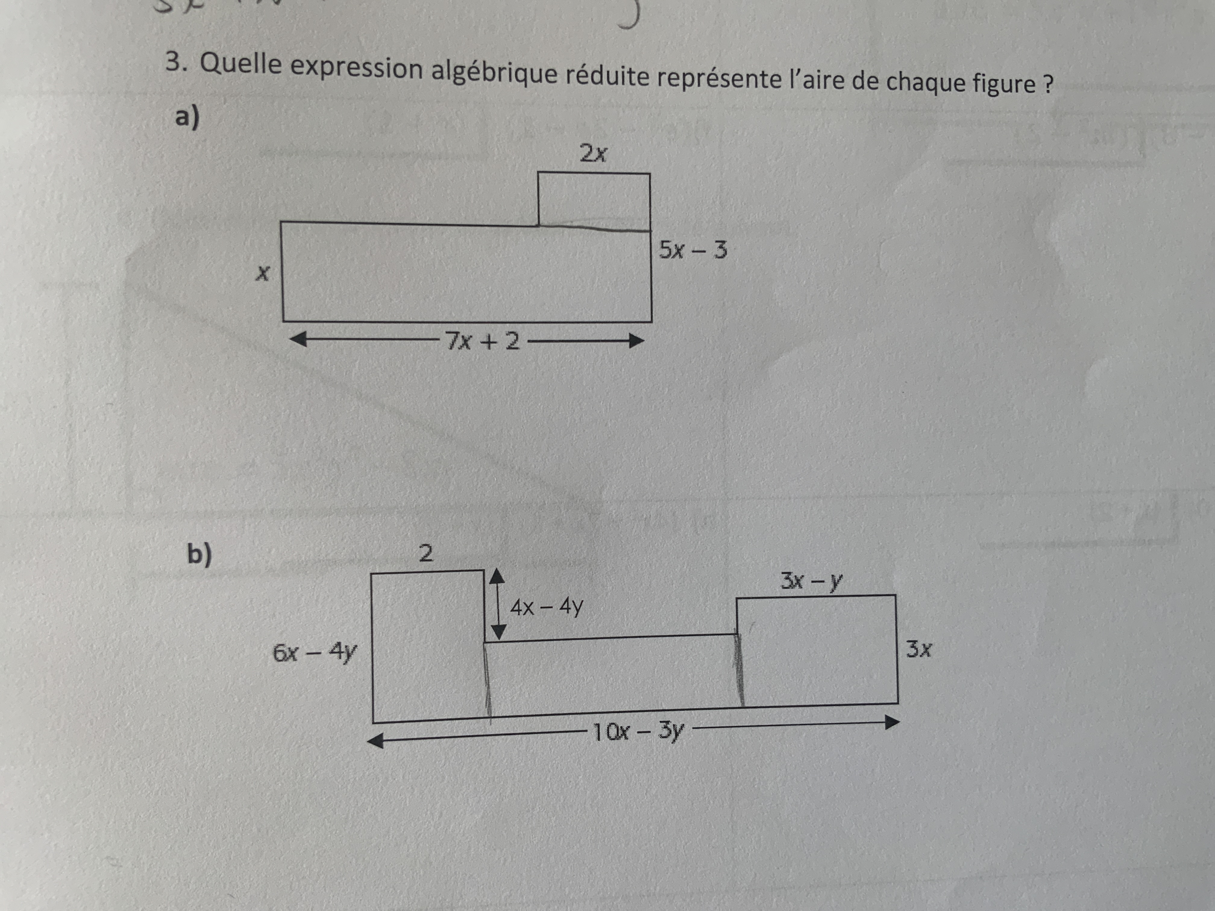 Secondary IV • 2mo.Salut, je ne comprend pas comment trouver une expression algebrique reduite qui représente l’aire de chaque figure.