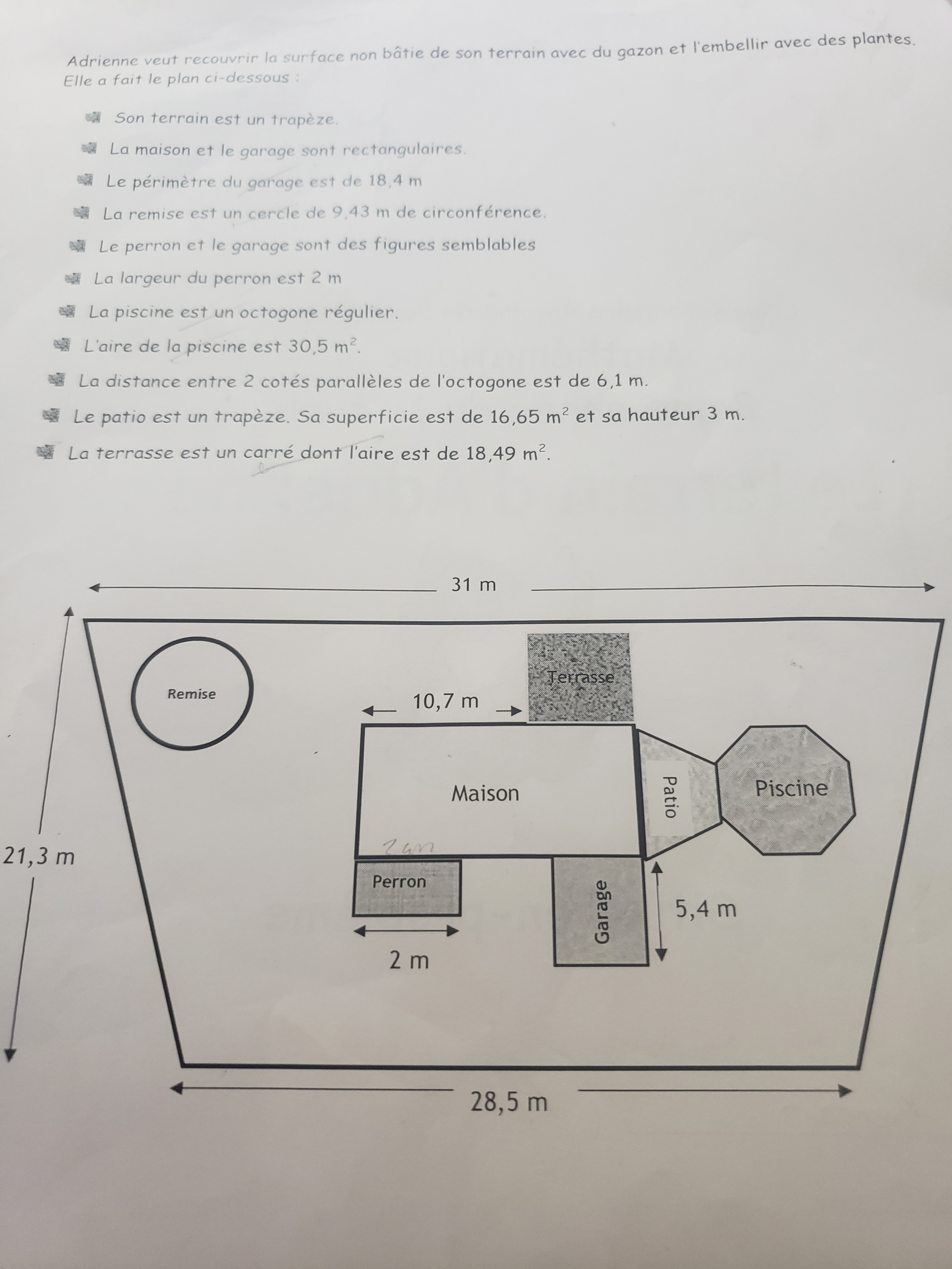 Secondary IV • 2yr.Bonjour , j’ai décomposer ma figure en un rectangle un trapèze et un carré pour ensuite trouver l’aire pour chacune de ses figures . Je cherche toutefois l’aire du jardin et je ne sais pas comment faire pour la trouver