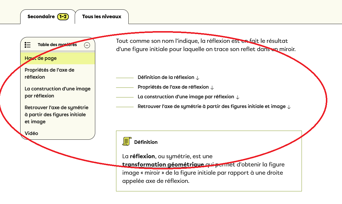 Lorsqu'on va consulter notre fiche sur les réflexions (https://www.alloprof.qc.ca/fr/eleves/bv/mathematiques/math-la-reflexion-m1407), on trouve cette table des matières où les incontournables sont nommés.