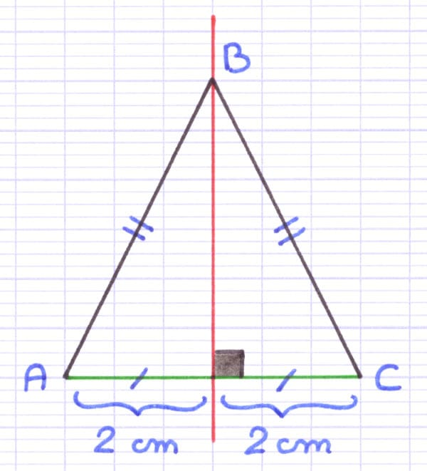 De plus, un axe de symétrie est une droite qui partage une figure en deux parties identiques et superposables par pliage. Par exemple, la droite rouge dans le dessin suivant est l'axe de symétrie du triangle isocèle :