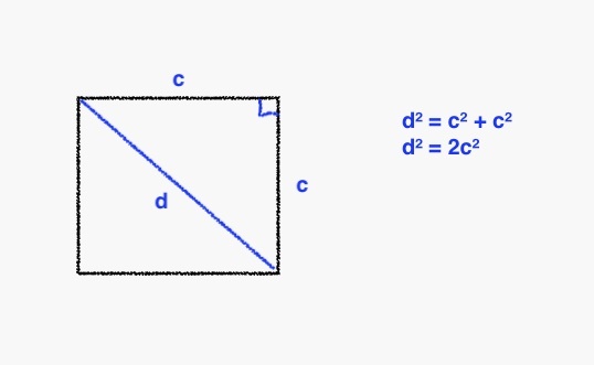 On peut voir que la diagonale sépare le carré en deux triangles rectangles dont l'hypoténuse est la diagonale en question.