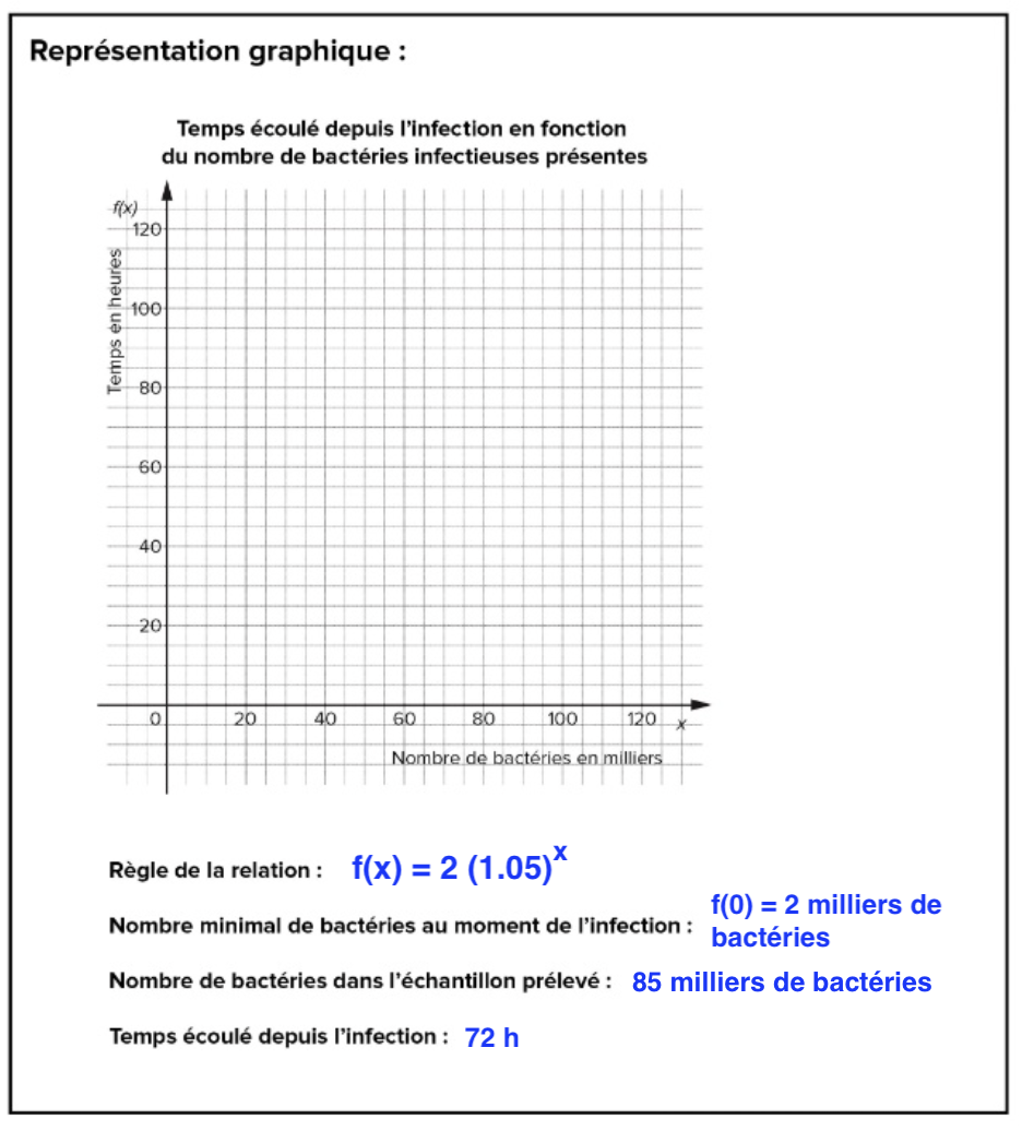 par contre pour savoir le temps x qui correspond à une infection de 85 milliers de bactéries alors oui tu dois utiliser la fonction inverse avec le logarithme en base 1.05