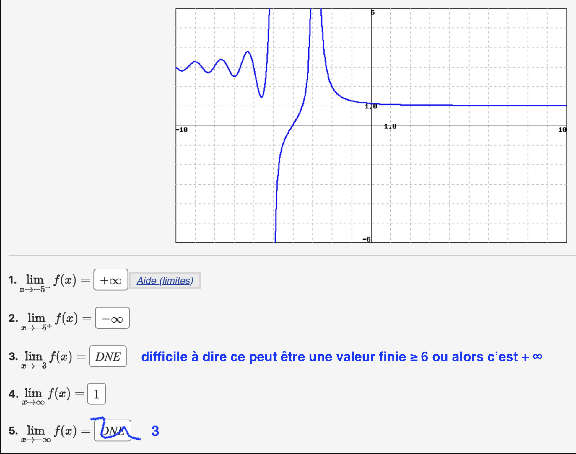 Pour x=-3, il faut considérer-3 par valeurs négatives et positives, tu as deux limites, et d'après ton graphe elles valent + linfini