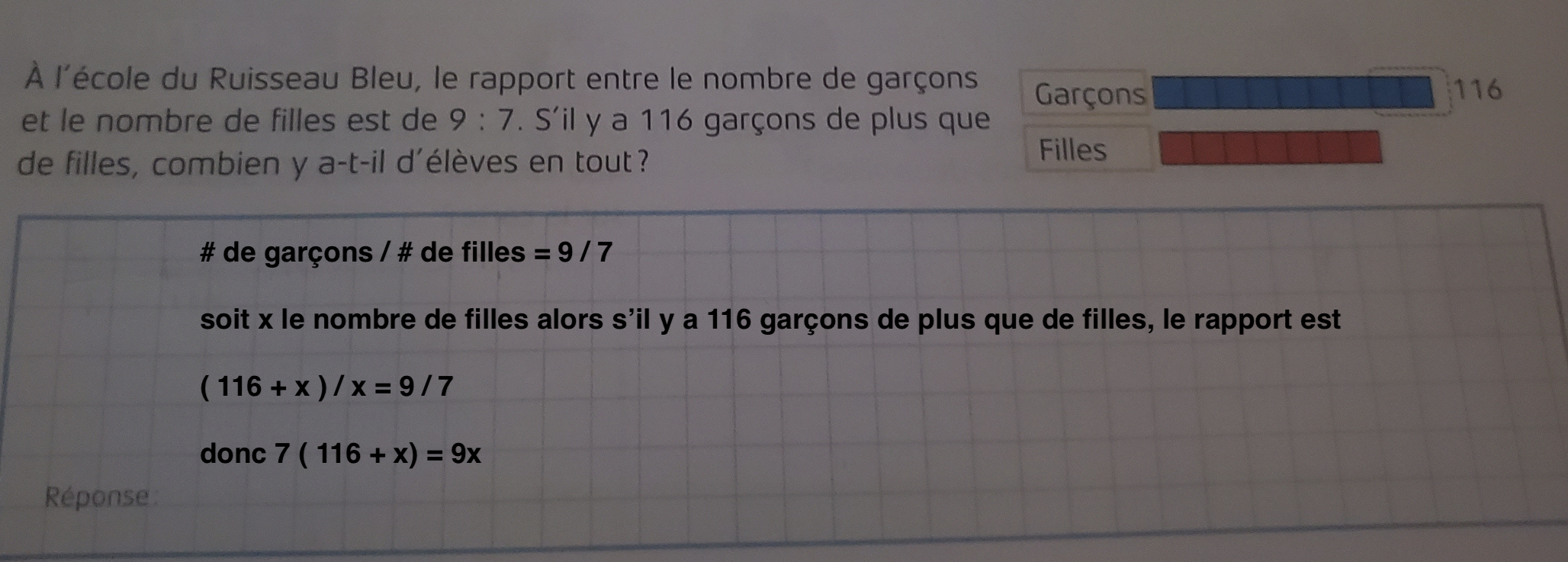Trouve le nombre de filles (x dans mon explication) et tu pourras déterminer le nombre total d'élèves