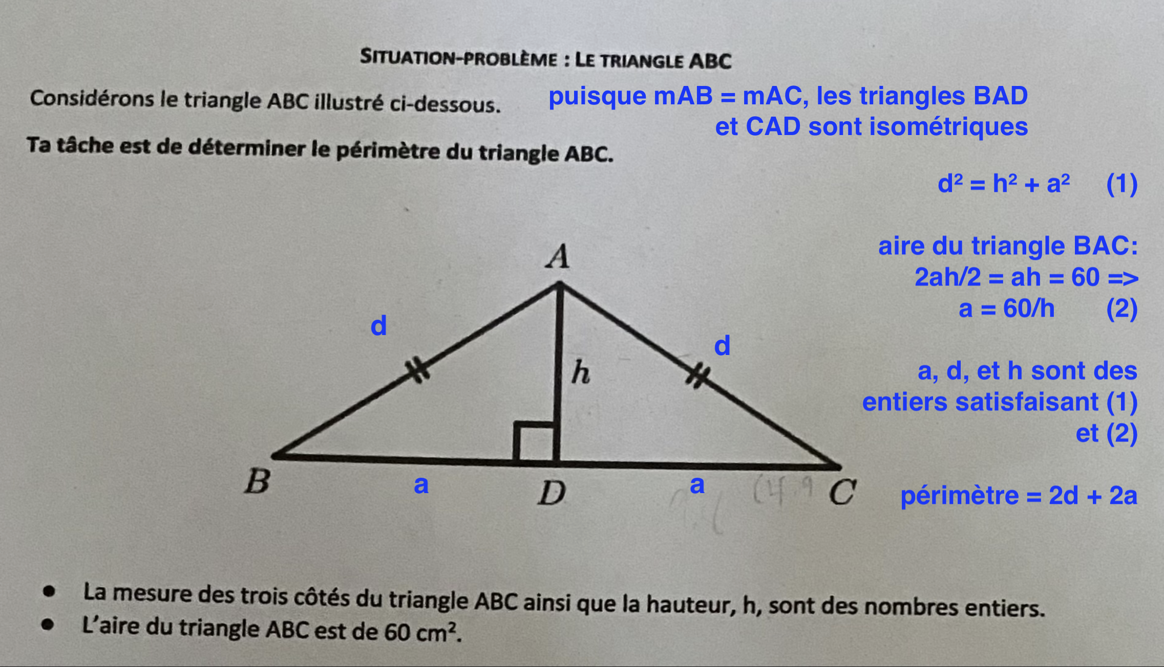 commence avec des valeurs de 10 ou plus par côté (le côté 2a est la base) considérant que l'aire est de 60 cm²