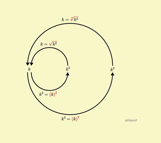 Lorsqu’on connait la valeur d’un des 3 rapports, il est possible de déduire la valeur des 2 autres à l’aide des propriétés des exposants et des racines. Le schéma suivant résume les opérations nécessaires pour passer d’un rapport à l’autre.
