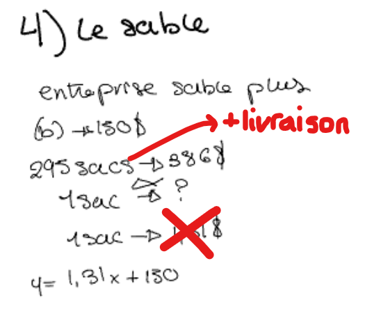 On paie ainsi les frais fixes de 150$ pour la livraison et 236$ pour les 295 sacs, pour un total de 386$. Tu peux ensuite diviser 236$ par 295 sacs pour avoir le coût d'un sac, ce qui donne 0,8$. Ce sera aussi le taux de variation de la règle.