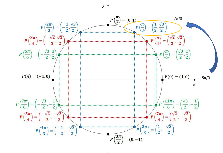 Cela a du sens, car nous savons que P(0)=P(2π)=P(6π/3). En ajoutant π/3, nous avons 7π/3 qui est à la même position que π/3.
