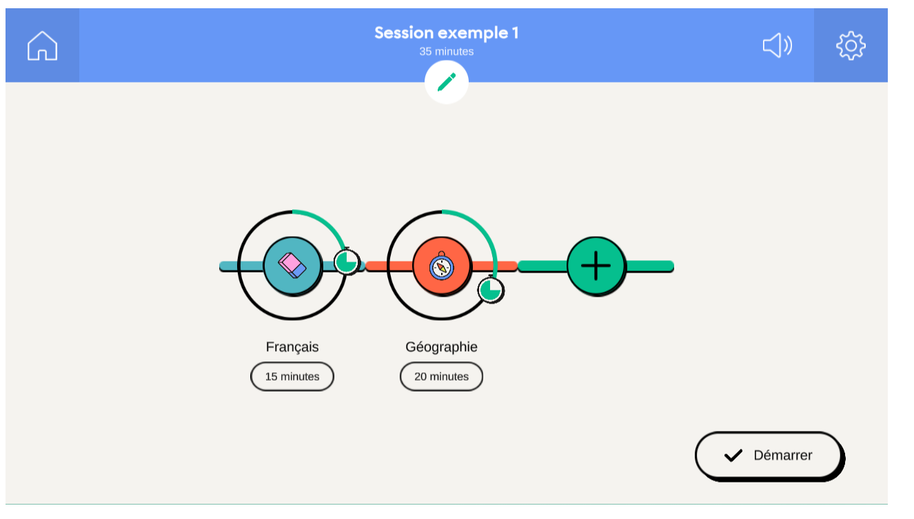 Tu peux cliquer sur chacune des matières pour les changer et tu peux glisser le petit cadran vert pour changer la durée. Aussi, si tu cliques sur le crayon en haut, tu peux changer le nom de la session.