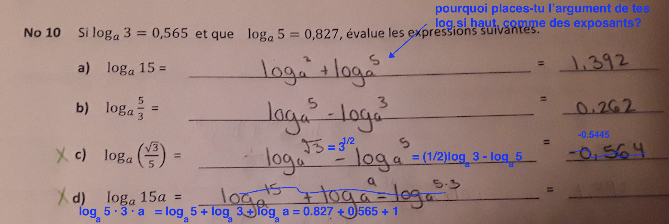 Ensuite, t'as juste à taper sur ta calculatrice l'opération de départ et tu auras n. Tu peux aussi remplacer dans ta forme exponentielle ton n par la valeur obtenue et voir si c'est bel et bien l'argument du logarithme. Répète cela pour le restant des numéros.