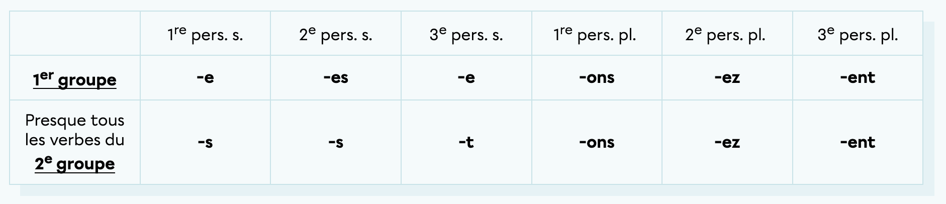 La terminaison -re appartient au deuxième groupe des verbes modèles. Ainsi, à l'indicatif présent, voici ses terminaisons:
