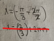Tu as ensuite effectué l'addition \(x=\frac{-\pi}{3}+\pi \), mais tu étais censé obtenir \(x=\frac{2\pi}{3} \) et non \(x=\frac{2}{3} \).
