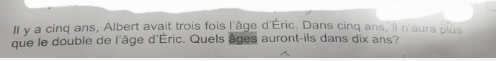 On nous dit qu'il y a 5 ans, donc lorsqu'Albert avait (x-5) ans et Éric (y-5) ans, Albert avait trois fois l'âge d'Éric. En d'autres mots, l'âge d'il y a cinq ans d'Albert était le triple de l'âge d'il y a cinq ans d'Éric. En équation, nous avons alors :