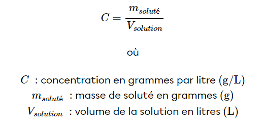 Pour trouver le volume d'une solution lorsque tu connais sa concentration et la quantité de soluté, tu dois utiliser la formule de la concentration. La voici :