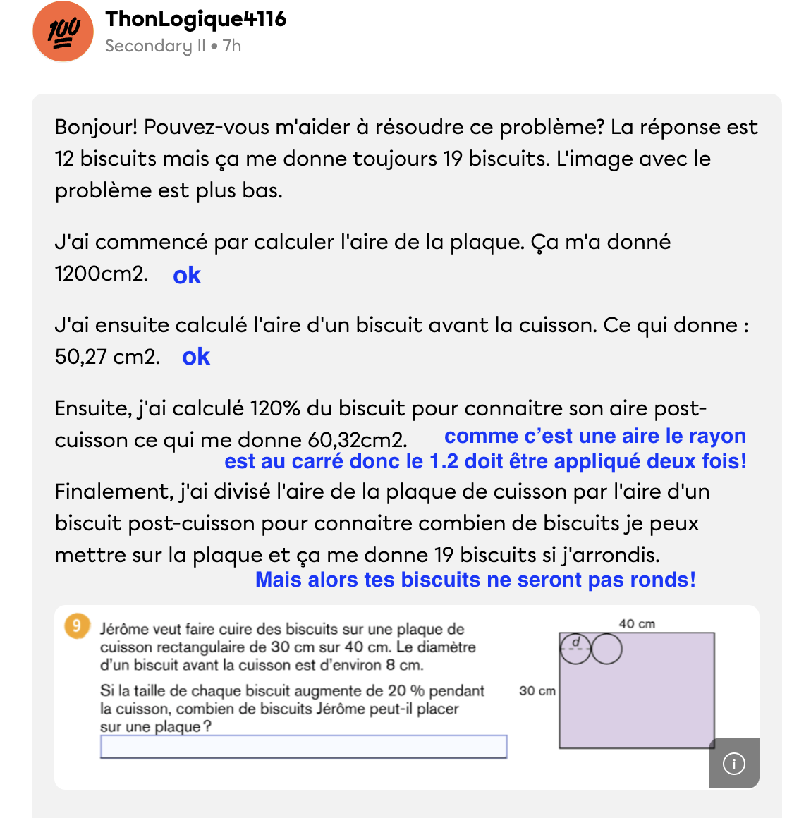 Dans le sens de la longueur tu peux placer 40/9.6 = 4.16 donc 4 biscuits complets au maximum et dans le sens de la largeur tu peux placer 30/9.6 = 3.125 donc 3 biscuits complets.