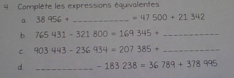Il arrive souvent que l'on cherche le terme manquant qui fera en sorte que des expressions soient équivalentes. Par exemple, 3 + ? = 2 + 4. Le terme manquant permettant aux expressions d'être équivalentes est 3. Voici d'autres exemples :