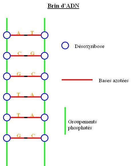 Dans l'ADN, on retrouve deux brins qui contiennent des nucléotides. Les nucléotides sont les bases A, T, C et G de ta question.