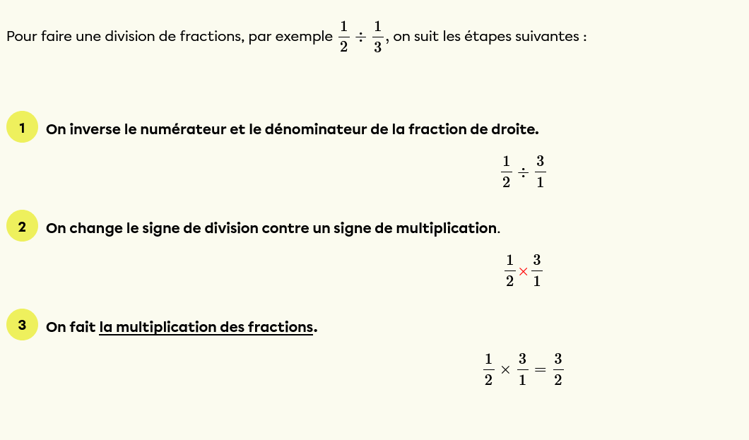 Voici la méthode pour diviser des fractions.