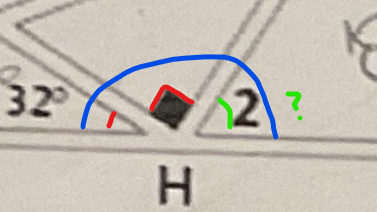 On a les angles rouges de 32 et 90 degrés, et on cherche l'angle vert. On peut trouver cet angle comme ceci :