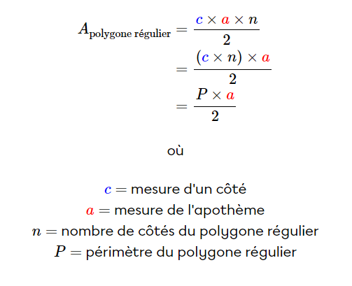 Tu peux commencer par trouver l'aire de l'hexagone à l'aide de la formule suivante :