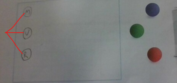 On a 3 résultats possibles à la première étape (au premier tirage). On a donc trois branches, une pour le mauve, une pour le vert, et une pour le rouge.