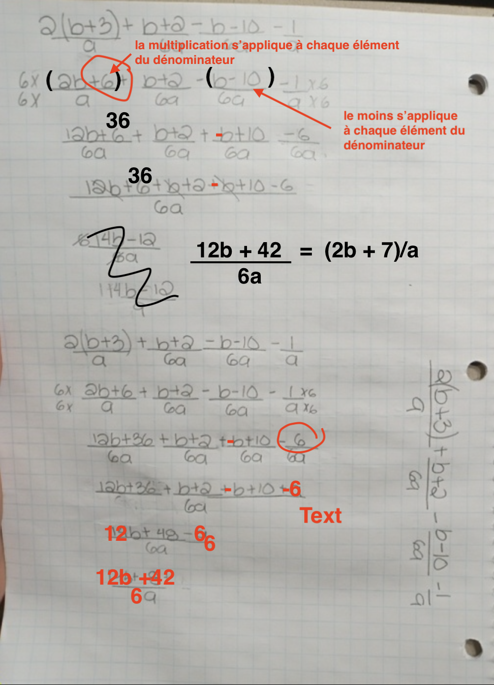 Tu as mélangé les signes de la troisième fraction et tu as transformé le -6 en a à la dernière fraction. Je te laisse continuer à partir de cette étape !