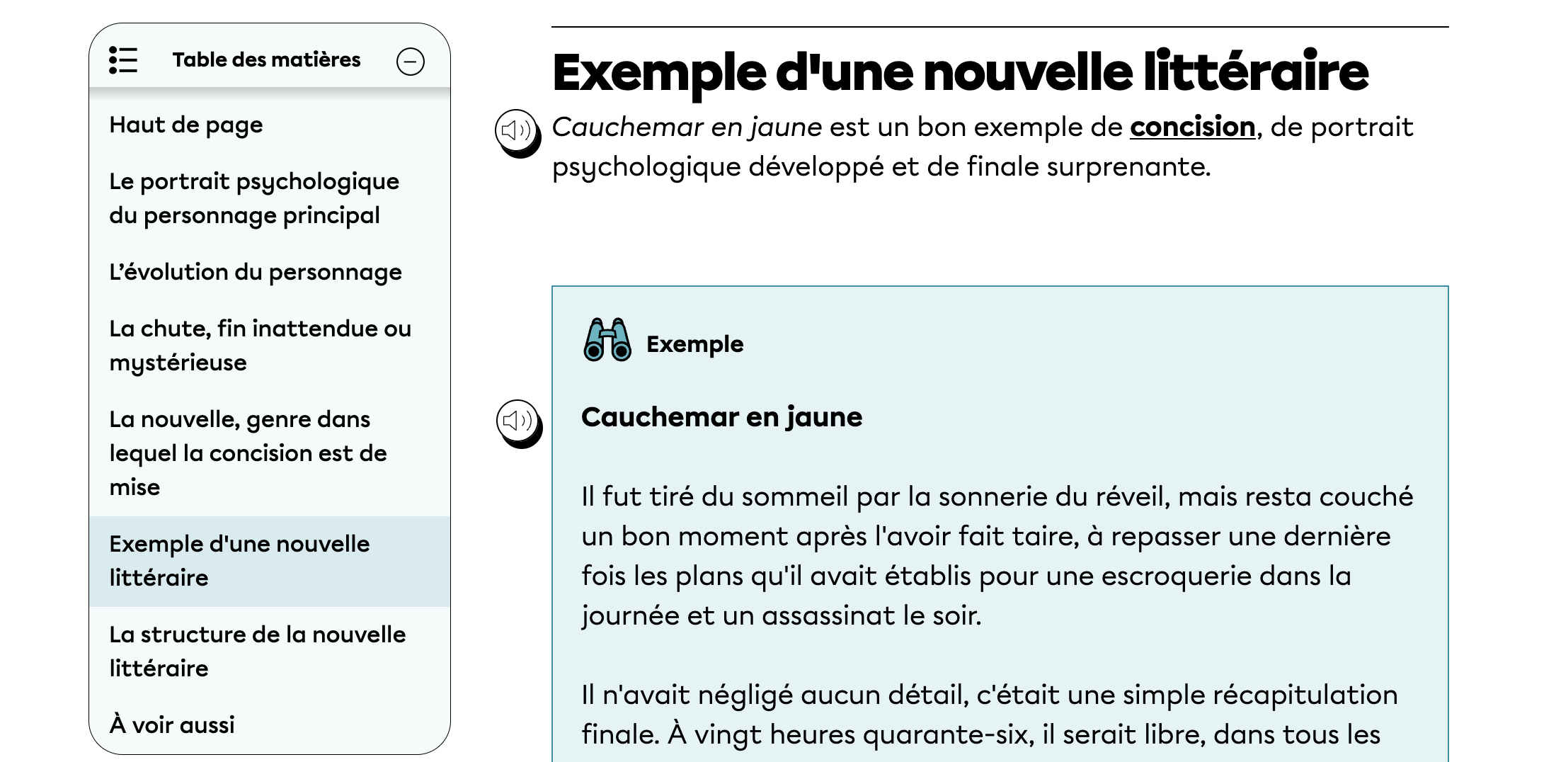Dans la section « Exemple d'une nouvelle littéraire », tu trouveras le texte que tu recherches. Il se trouve dans un grand encadré bleu.