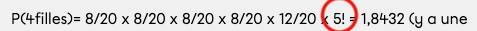 Tu ne dois pas multiplier par 5! mais tout simplement par 5. Parce que tu as 5 façons différentes d'obtenir 4 filles parmi les 5 personnes choisies (FFFFG - FFFGF - FFGFF - FGFFF - GFFFF).