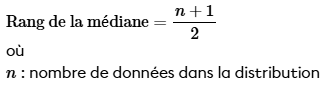 La médiane est la valeur du milieu lorsque les nombres sont classés dans l'ordre croissant (ou décroissant). Pour calculer le rang du nombre qui est la médiane, on utilise cette formule :