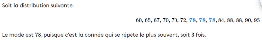 Ensuite, le mode est la valeur qui apparaît le plus souvent dans un ensemble de données. Pour trouver le mode d'une distribution, il n'y a donc aucun calcul à faire, il faut simplement regarder le nombre qui apparait le plus de fois dans la distribution de nombres. Voici un exemple :