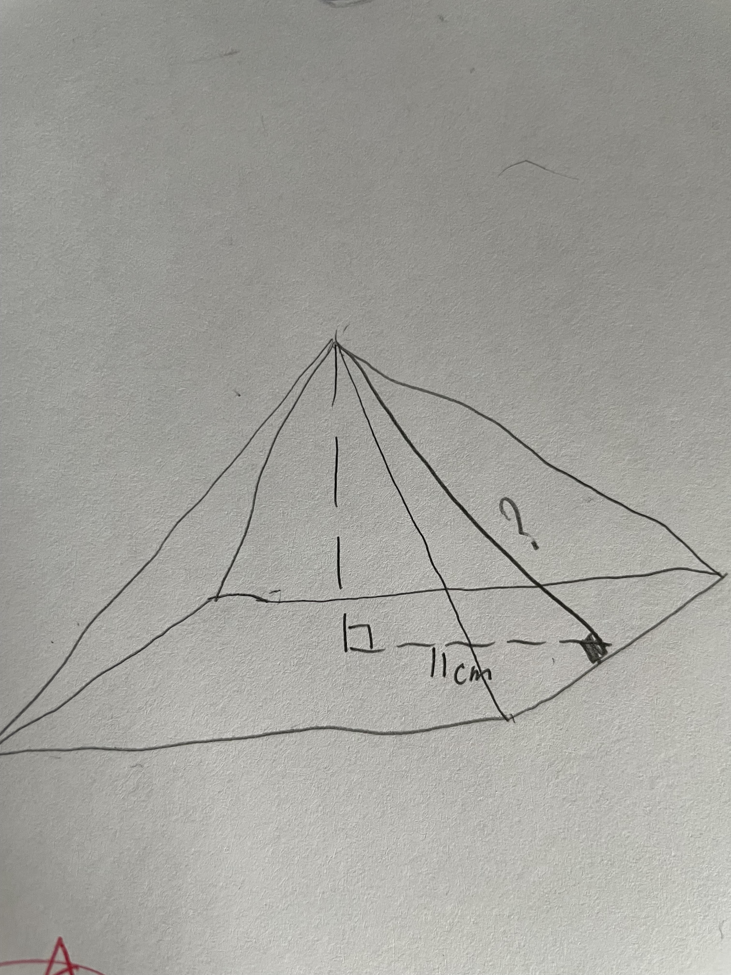 Je crois que si tu essaies de trouver la hauteur de la pyramide tu seras capable de résoudre par la suite