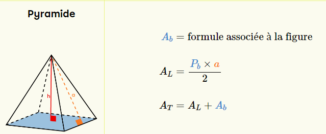 Tout d'abord, on peut trouver l'aire d'une pyramide à l'aide de la formule suivante :