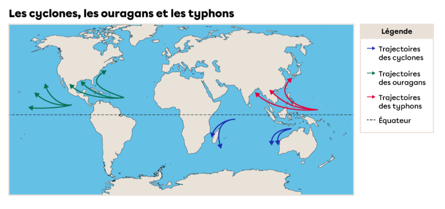 Dans le cas des cyclones, typhons et des ouragans, ceux-ci se forment généralement proche de l'équateur, en raison des conditions météorologiques favorables comme l'air chaud et humide.