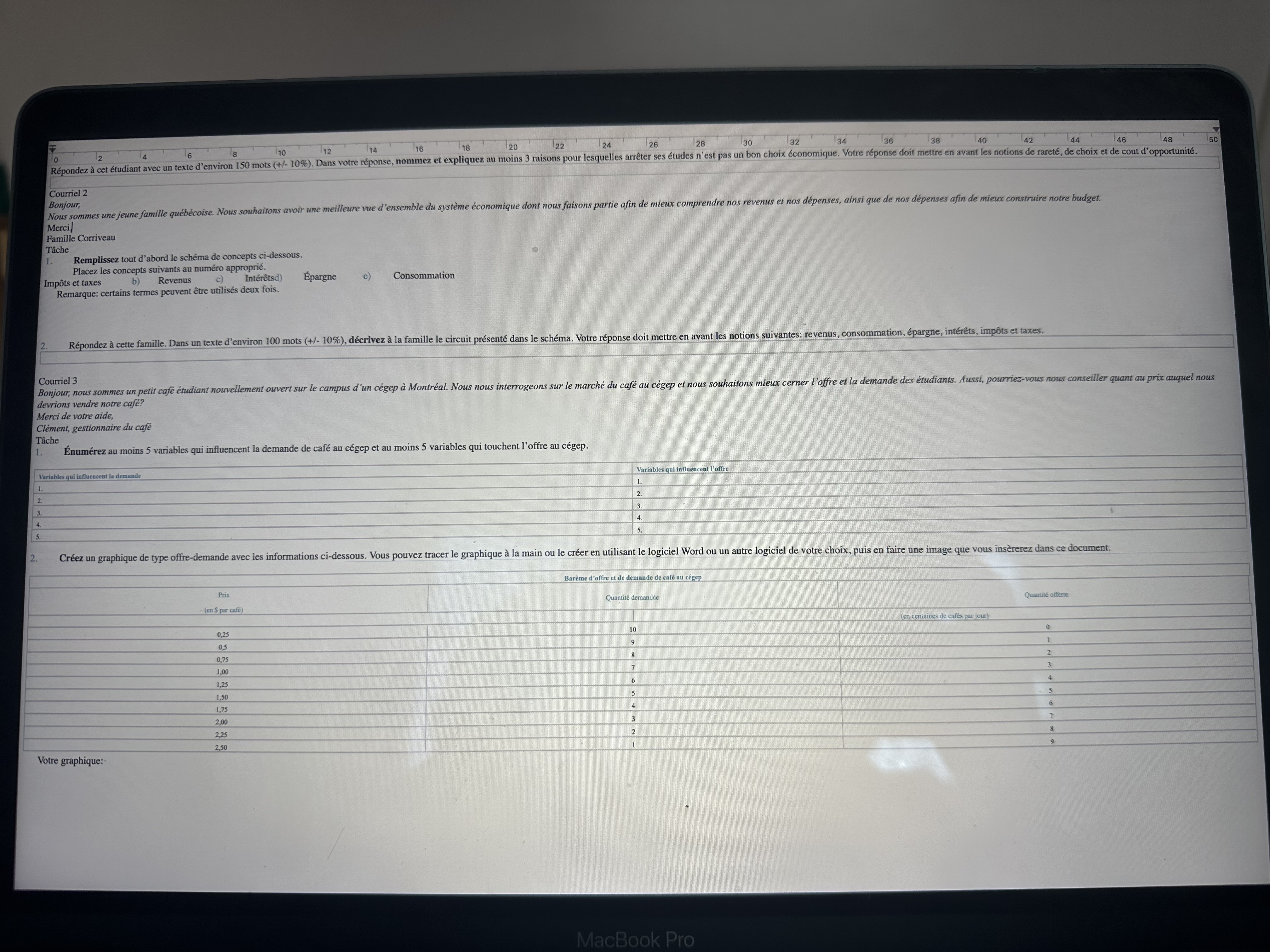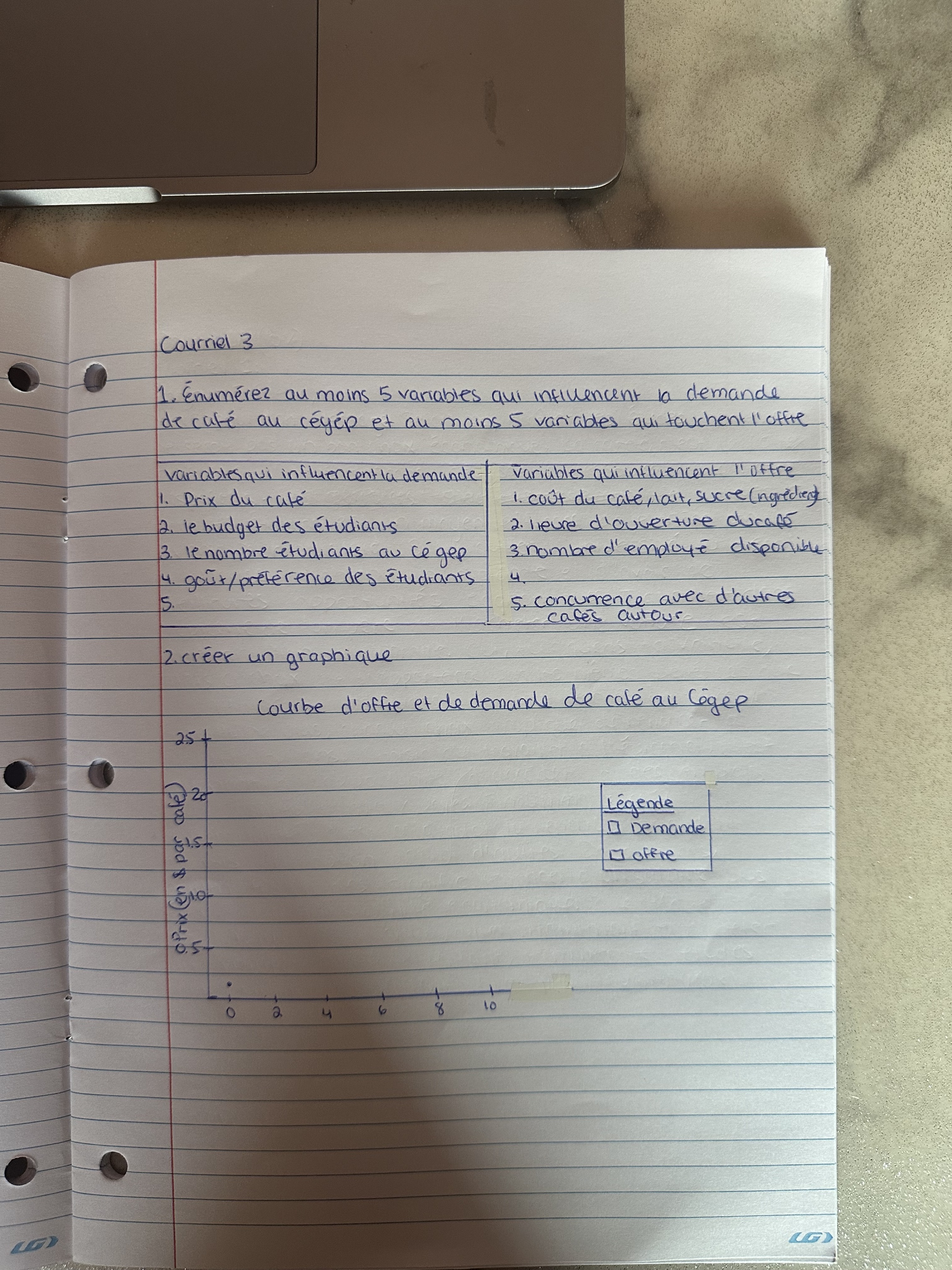 Postsecondaire • 3mBonjour, je suis actuellement en train de travailler sur un devoir (courriel 3) pour mon cours d’économie, et malgré mes efforts, je rencontre plusieurs difficultés. J’ai passé beaucoup de temps à essayer de comprendre et à compléter mes exercices, mais je n’arrive toujours pas à progresser. En particulier, j’ai du mal avec la notion d’offre et de demande. J’ai consulté plusieurs sites d’entraide et demandé de l’aide autour de moi, mais je reste bloqué. J’ai tenté de réaliser un tableau et de réfléchir aux variables qui influencent l’offre et la demande, mais je ne suis pas certain que mon travail soit correct ou cohérent avec les attentes de l’exercice. Mon devoir consiste notamment à : Enumérer 5 variables qui influencent la demande de café au cégep, énumérer 5 variables qui influencent l’offre de café au cégep et réaliser un graphique représentant ces éléments. Je vous écris donc pour savoir s’il serait possible de m’aider à mieux comprendre et à réussir cet exercice. Je vous joins ce que j’ai fait jusqu’à présent ainsi que l’énoncé de l’exercice afin que vous puissiez voir où je me suis trompé. Merci beaucoup pour votre aide et votre disponibilité.