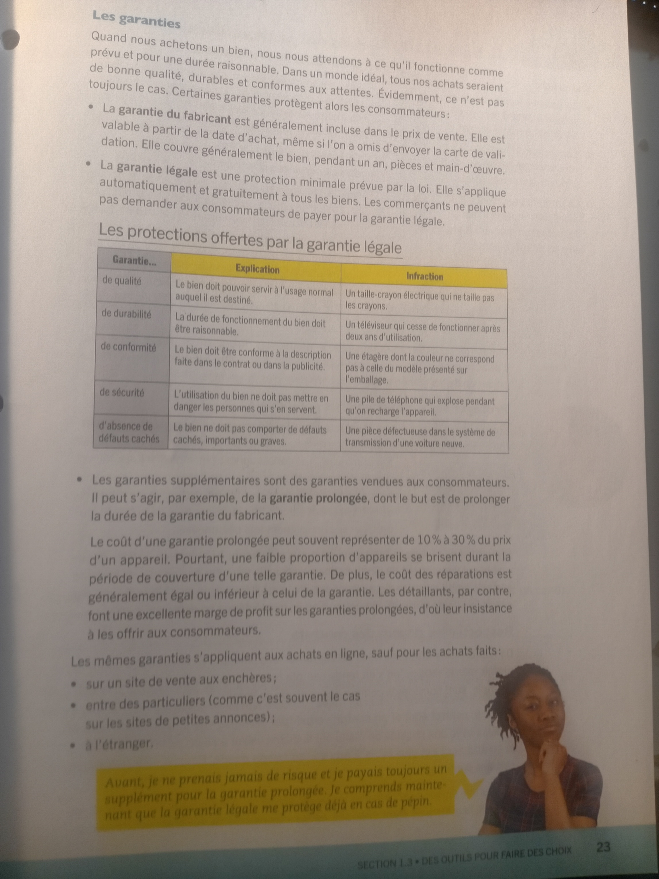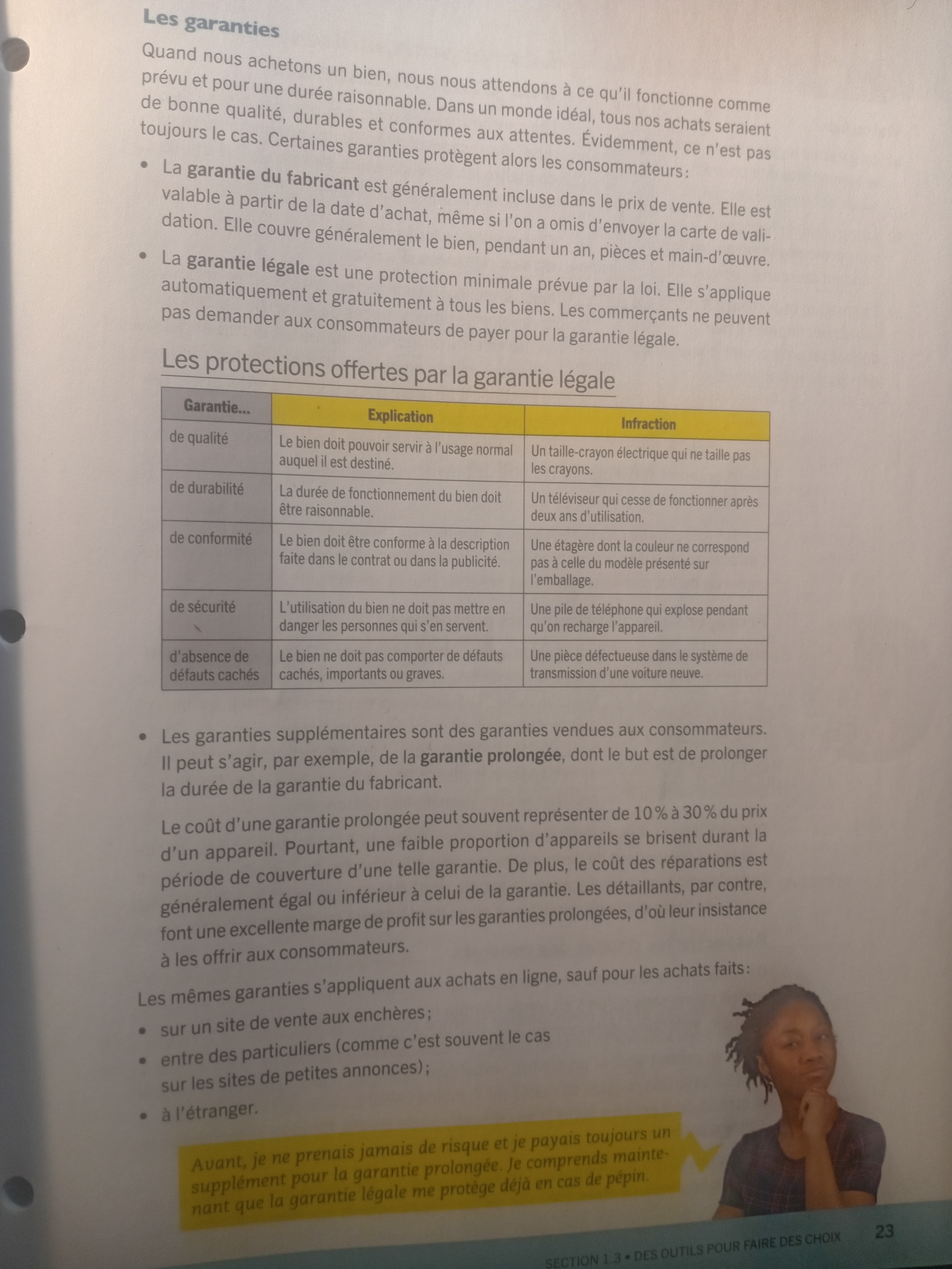 Secondaire 5 • 1mVous avez dit<<La garantie légale est une protection automatique et gratuite pour le consommateur, imposée par la loi, qui couvre les défauts de fabrication ou les vices cachés.>> je ne comprends pas quel protection vous parlez. Vous avez dit des défauts de fabrication ou les vices cachés. Je n'ai rien compris ce vous avez dit.
