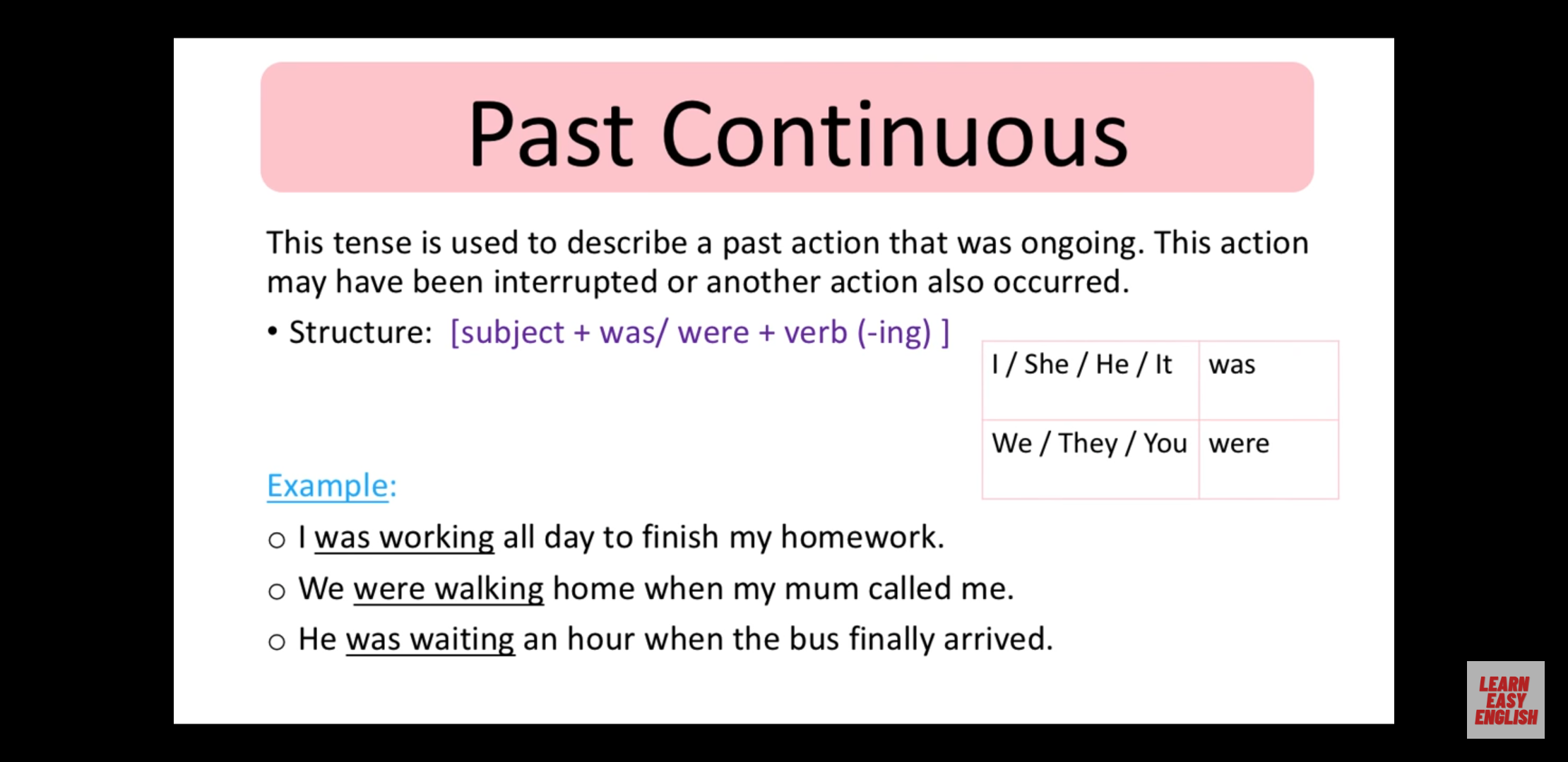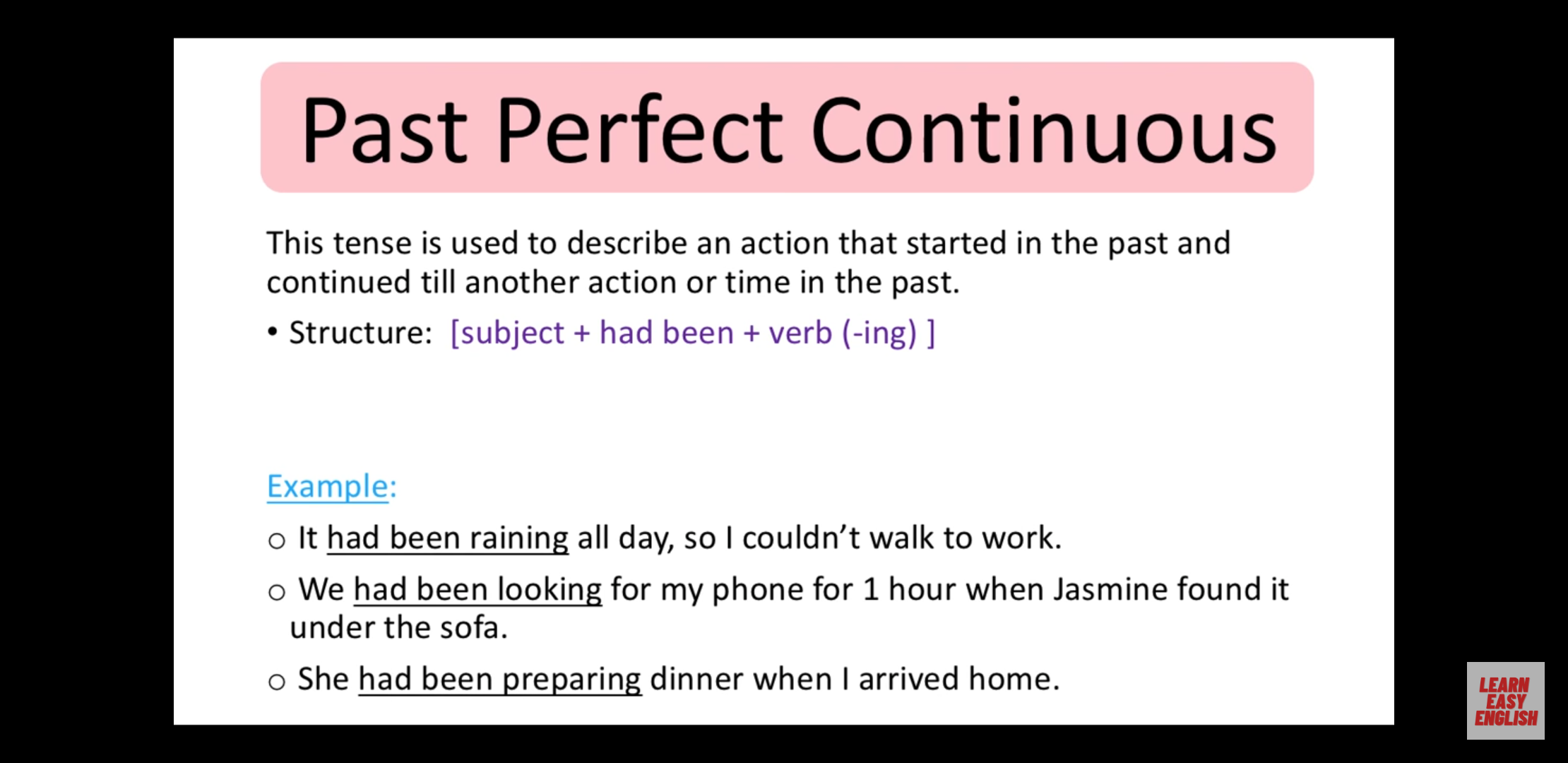 Secondaire 4 • 1aBonjour je n'ai pas compris le past perfect continuous parce que ça dit that started in the past and continued till another action or time in the past et quand je lis c'est phrase je ne vois pas ça merci expliquez moi